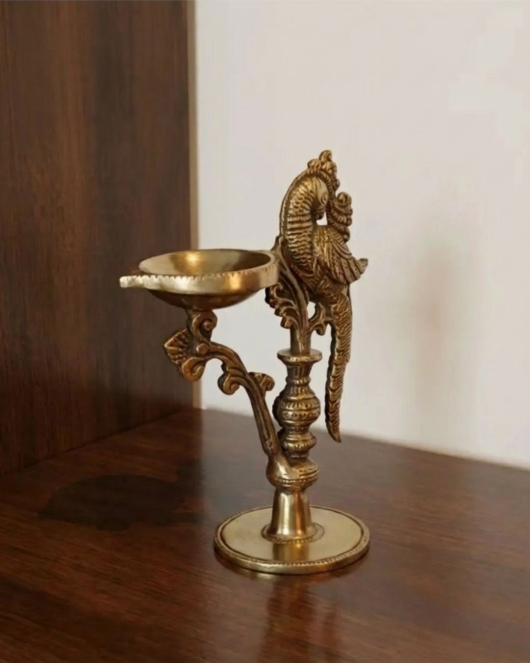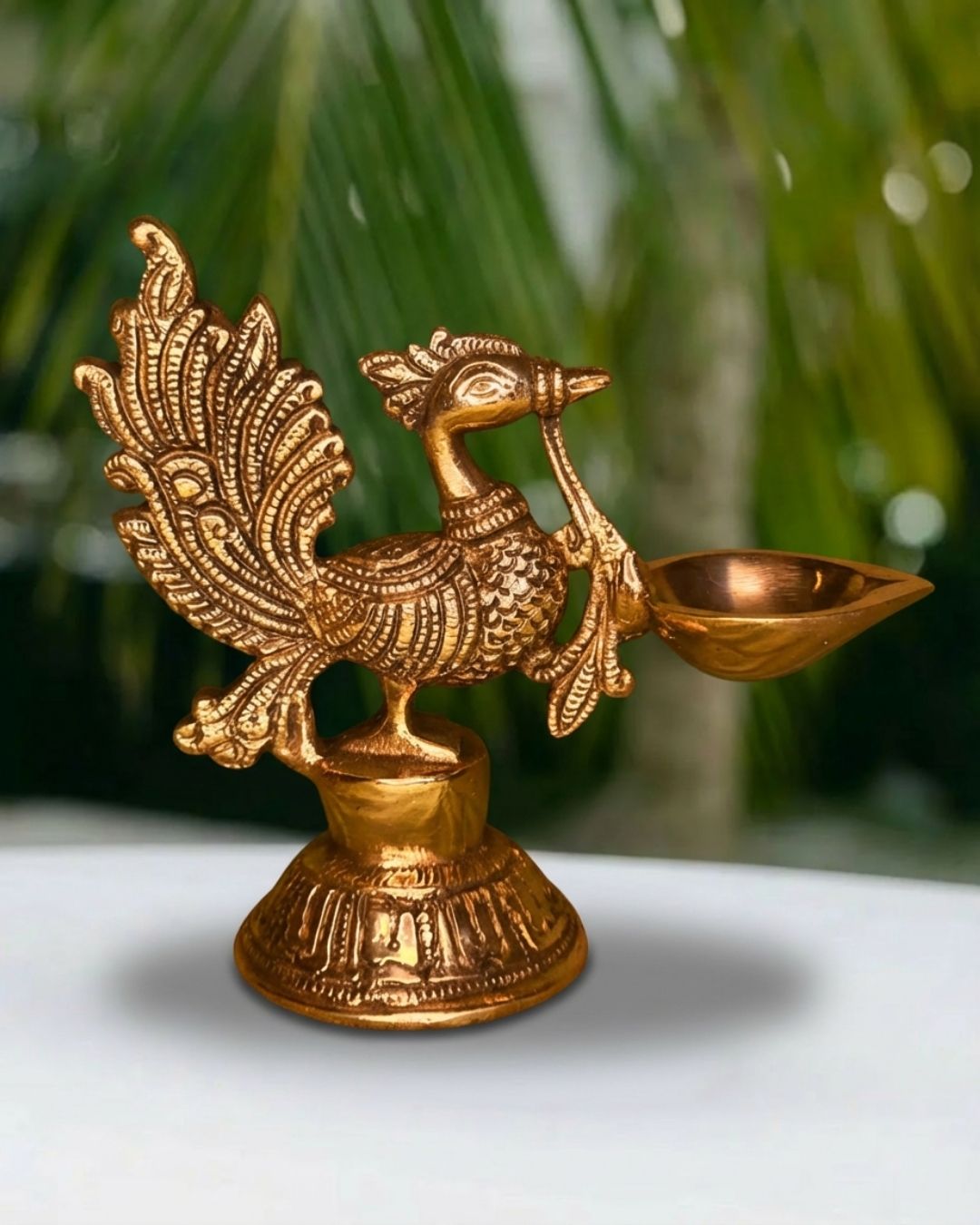 Intricately designed solid peacock diya with lamp