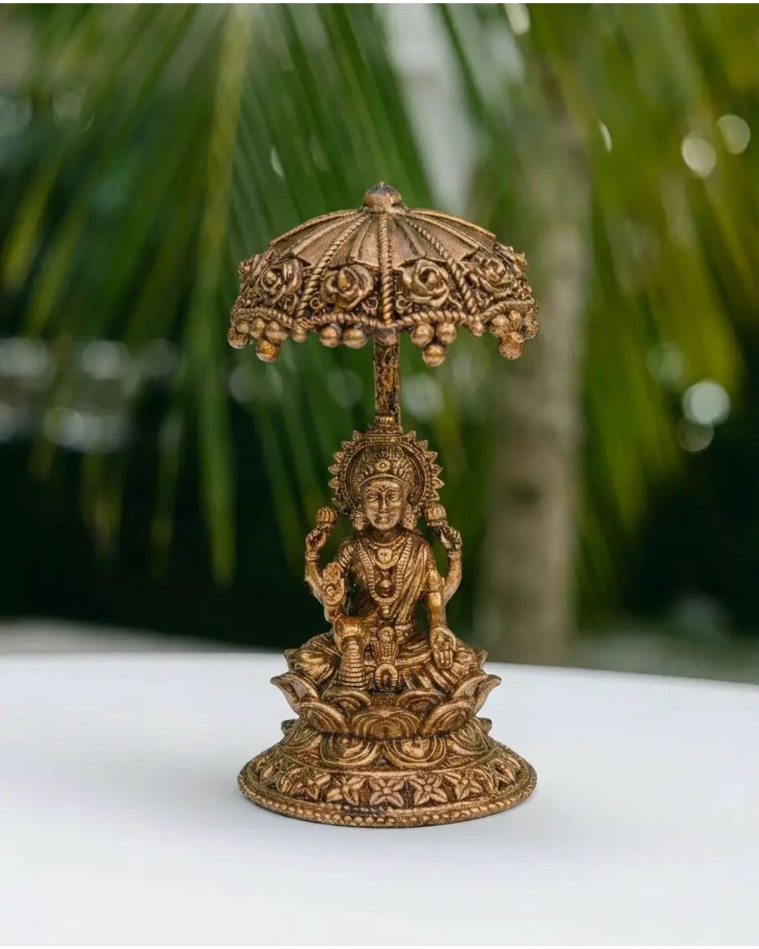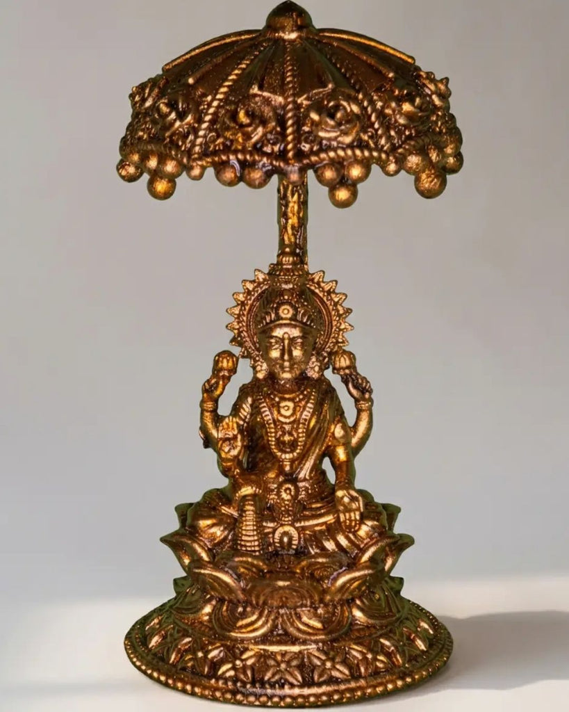 Sri Maha lakshmi devi in lotus with umbrella in brass antique finish is backordered and will ship as soon as it is back in stock.