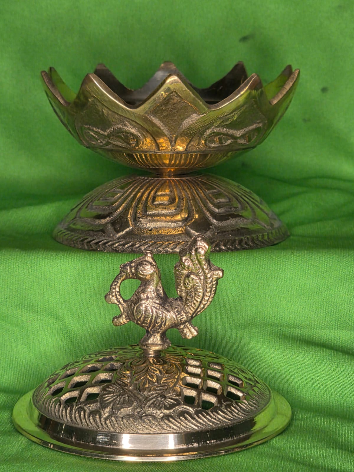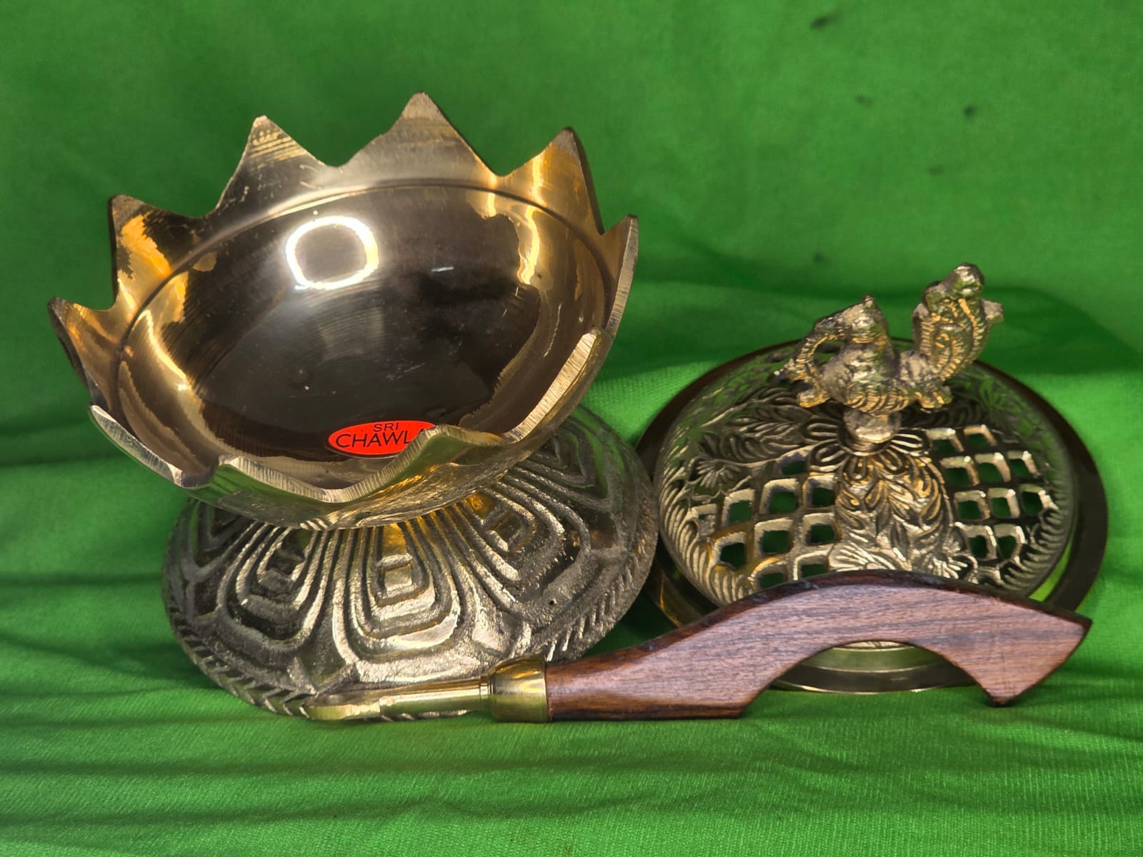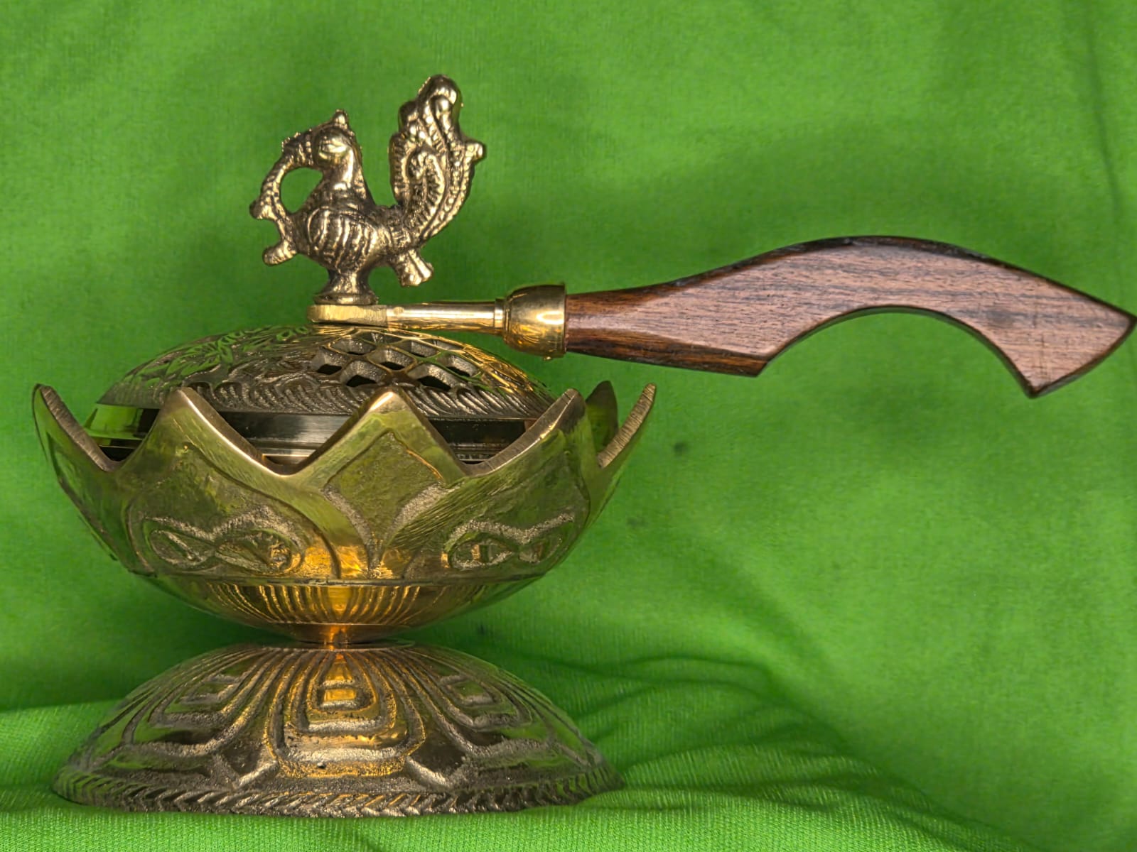 Aesthetic design and Annapakshi figure add more grace to this solid loban/ sambrani stand with wooden handle