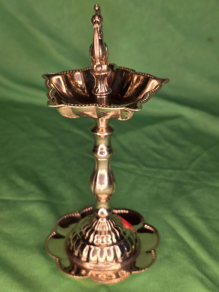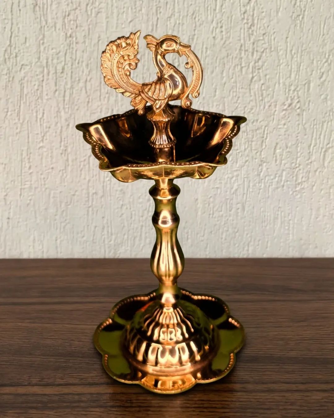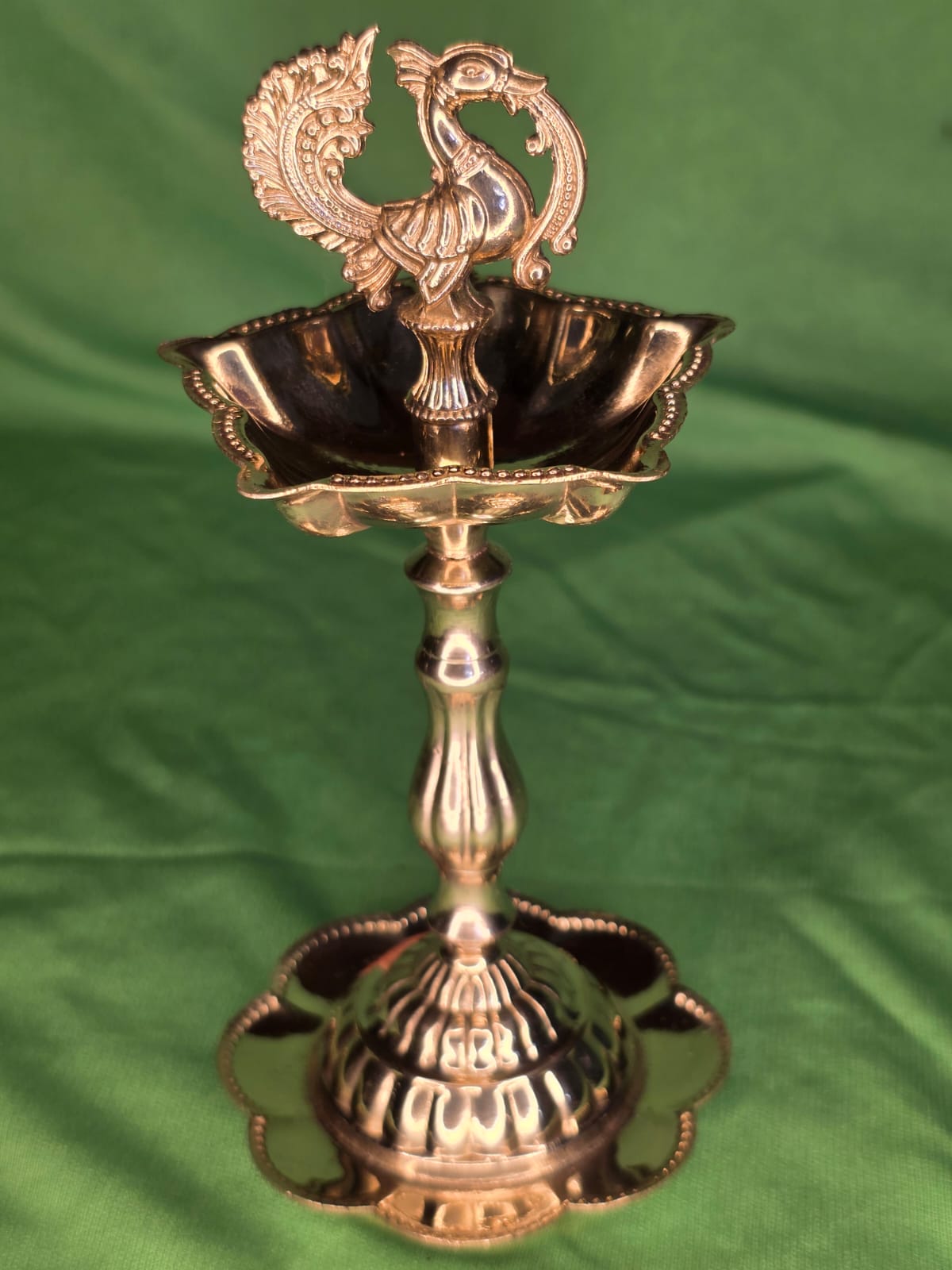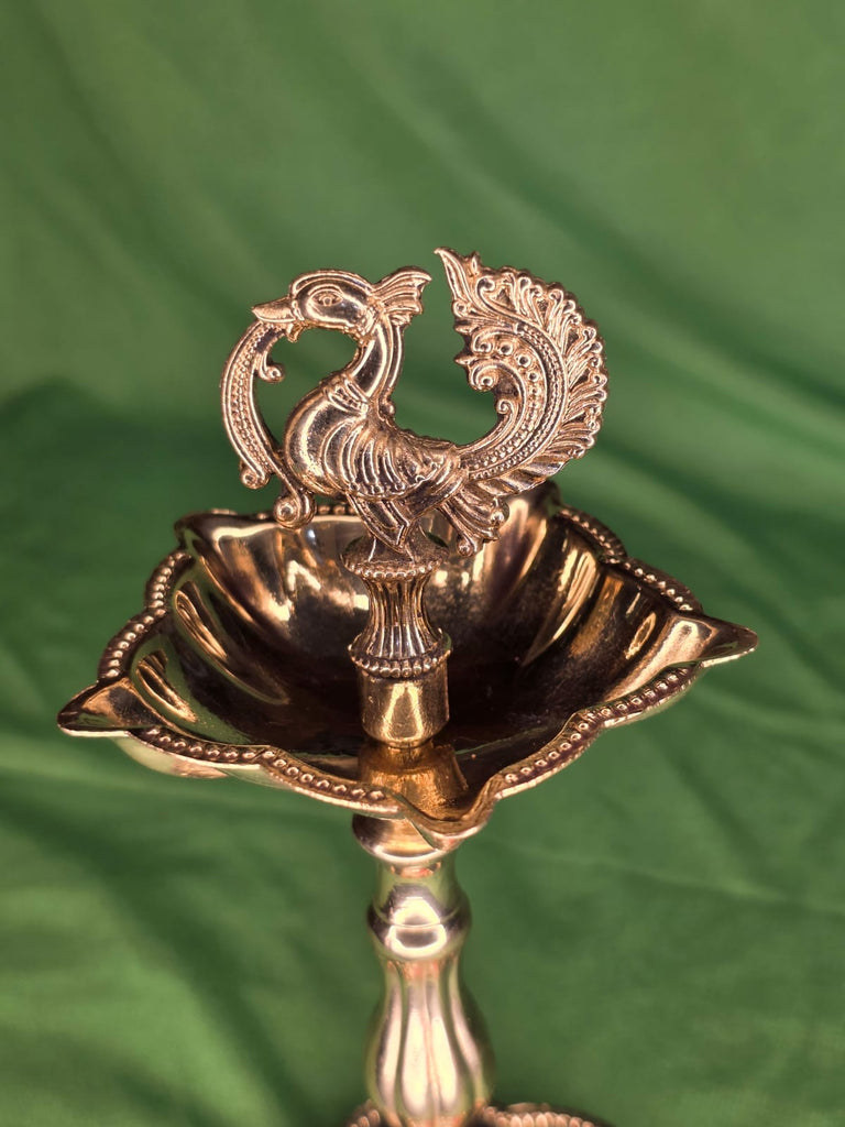 This attractive 5 pointed brass diya is aesthetically designed with auspicious annapakshi figurine